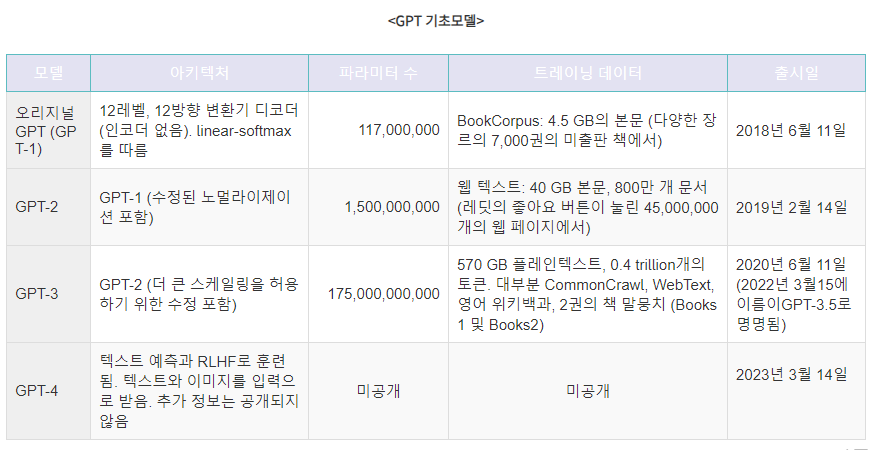 | GPT-4 | 텍스트 예측과 RLHF로 훈련됨. 텍스트와 이미지를 입력으로 받음. 추가 정보는 공개되지 않음 | 미공개 | 미공개 | 2023년 3월 14일 |
