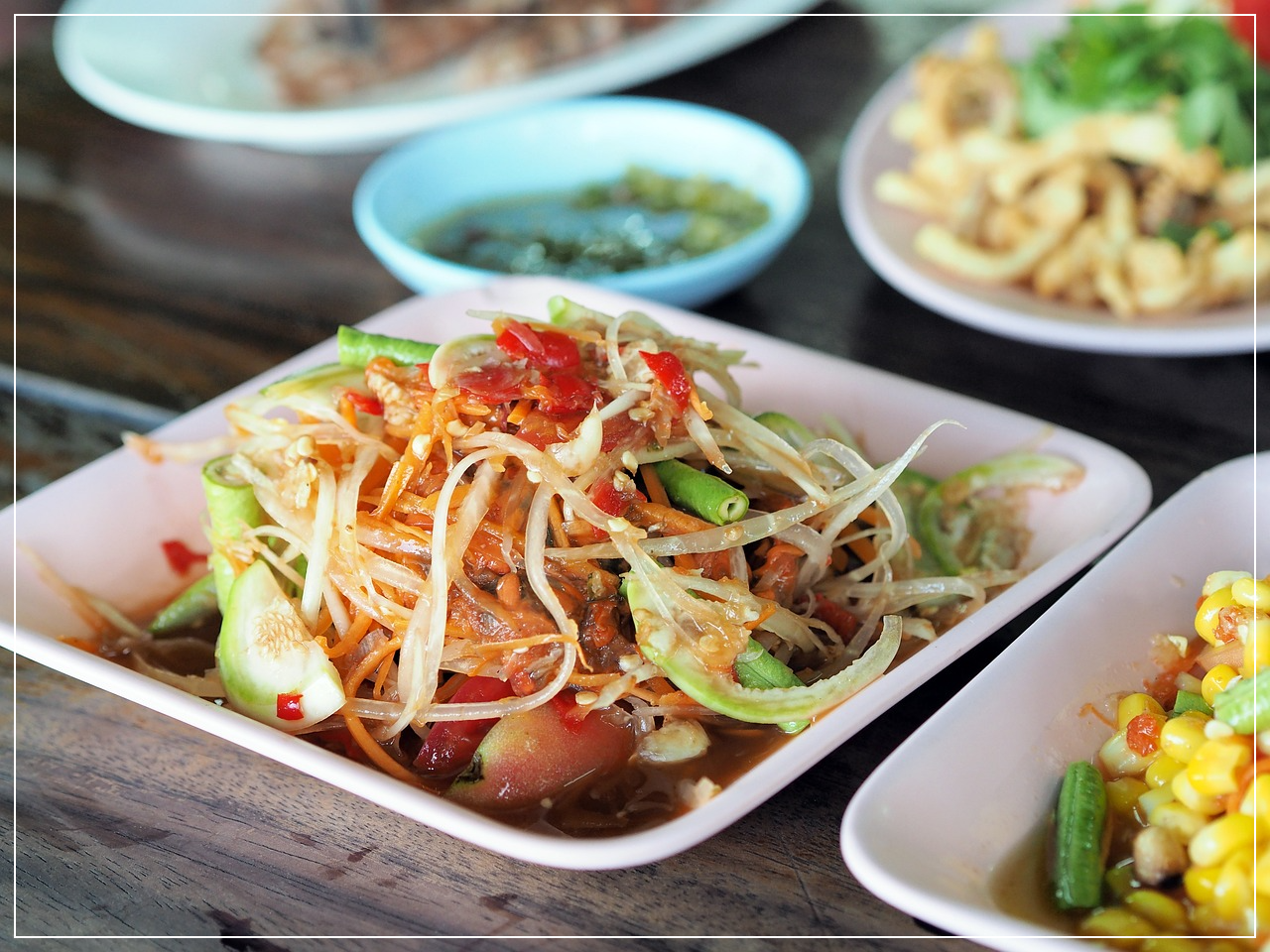 쏨땀(Som Tam) - 태국식 파파야 샐러드로, 신선한 재료와 매콤한 소스가 어우러져 상큼한 맛을 제공합니다.