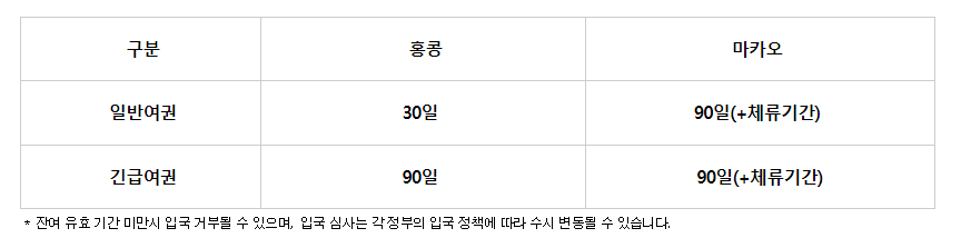 홍콩(Hong Kong) - 여권 유효기간이 본인의 여행일정을 제외하고 최소 1개월 이상 남아있는 경우 입국이 가능