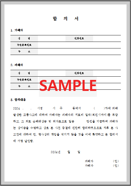 본문 하단에 [교통사고 합의서 양식]이 첨부되어 있으니 다운로드해서 사용하시면 편리합니다.