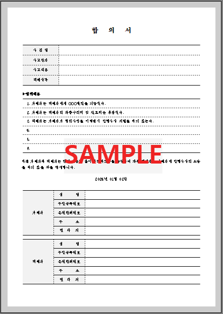합의서의 작성일자를 정확하게 기재해야 합니다. 가끔 미리 합의서를 작성하여 두었다가 계약당일에 해당일자를 기입하는 것을 누락하는 경우가 있는데 주의하시길 바랍니다.