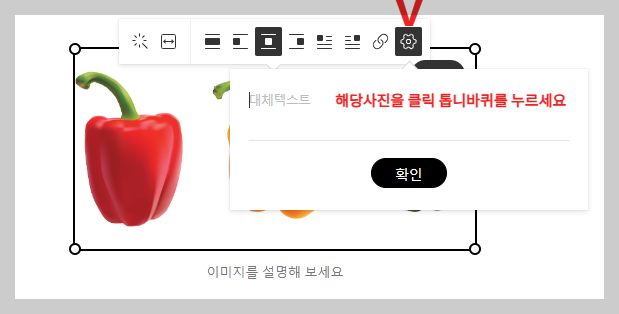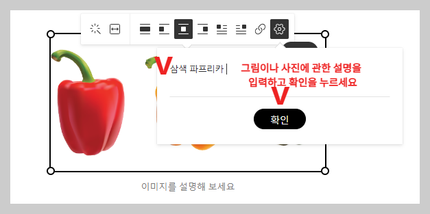 대체텍스트를 입력하는 방법 - 해당그림이나 사진에 대한 설명을 간단하게 입력한 후 확인을 눌러줍니다.