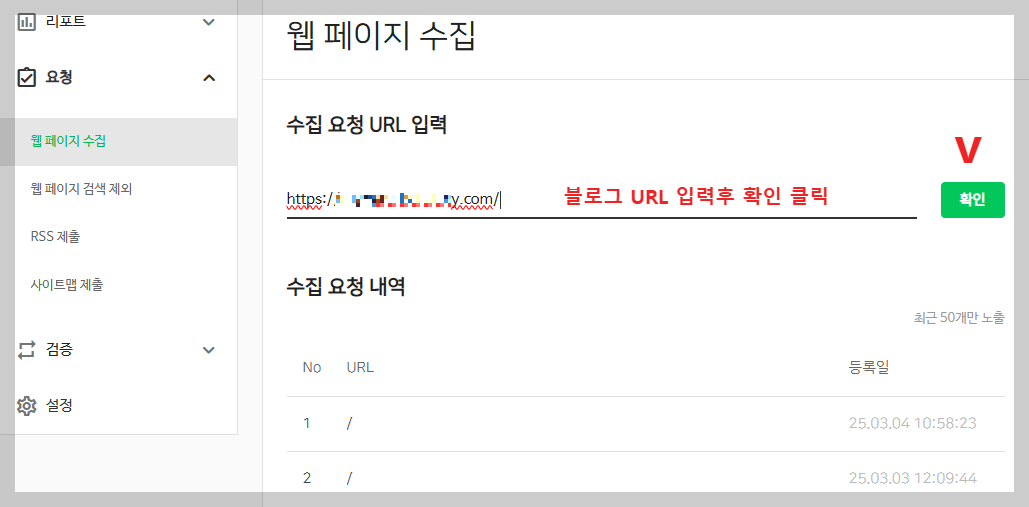 마지막으로 웹페이지 수집에서 본인의 블로그 URL을 입력후 확인버튼을 눌러 사이트의 수집요청을 합니다.