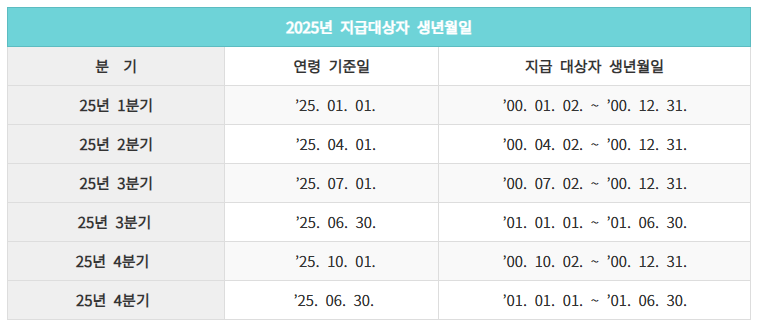 2025년 01월 01일 기준 24세 청년에 한해서, 지난 분기 미신청분 추가신청 가능